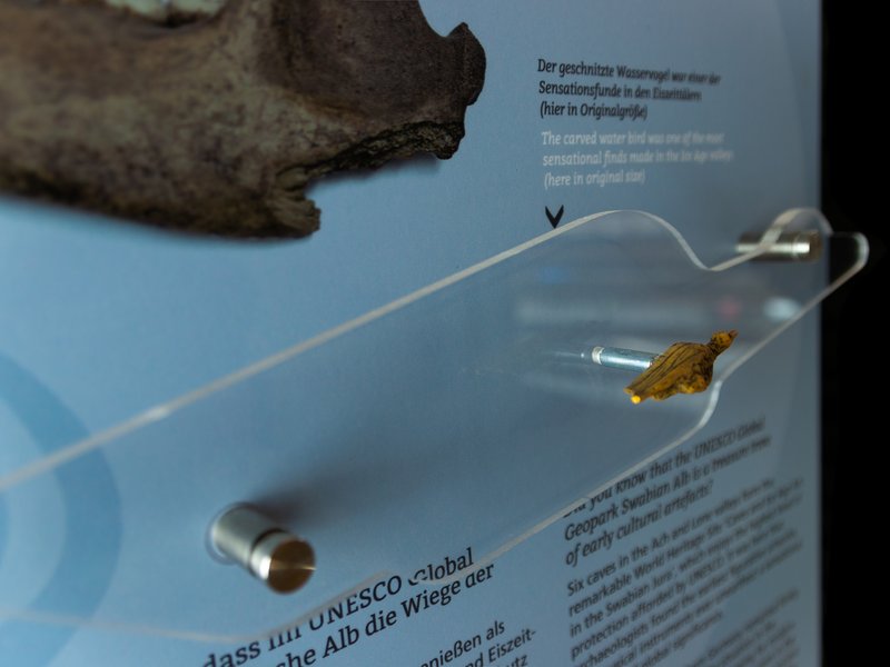 Das neue Präsentationskonzept spricht die Besucher*innen über 3-D-Objekte, ein frisches Farbklima und starke Bildwelten emotional an. Es ist modular aufgebaut, d.h. zur Auswahl stehen eine Wandtafel-Lösung mit sechs Einzelelementen oder Stelen für den Innen- bzw. Außenbereich. Ergänzt wird das Konzept durch einen Tablet-PC, auf dem z.B. der Geopark-Imagefilm zu sehen ist. Visualisiert werden die vier Kernthemen der Alb: Höhlen, Fossilien, Eiszeit und Erdschätze. Außerdem wird das weltweite UNESCO-Geopark-Netzwerk präsentiert, das 161 einzigartige Landschaften auf der ganzen Welt umfasst. Alle Texte sind in deutscher und englischer Sprache verfasst.