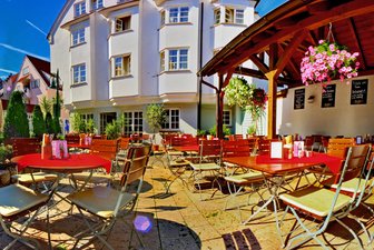 In den Sommermonaten lädt unser schöner Biergarten im Innenhof zum Verweilen ein.